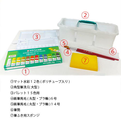 サクラクレパスのマット水彩12色が入った水彩絵具セット。小学校低学年~高学年むけ。バッグは通気性が良く、スポーティな生地を使用した元気なデザインです。