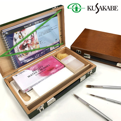 これがあればすぐに水彩画をはじめられます。水彩画を描くのに必要な絵具や紙、パレット、筆などが一つの木箱にまとまったセットです。木箱はグリーンとブラウンの2色から選べて、小ぶりでおしゃれなデザイン。