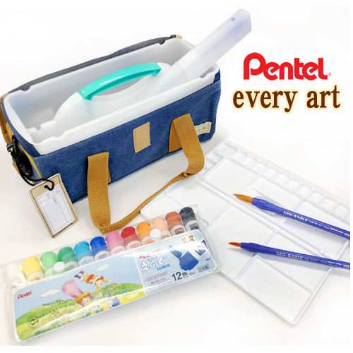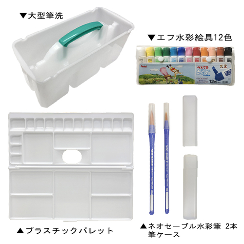 ぺんてるエフ水彩絵具の12色が入った水彩絵具セット。小学校低学年~高学年むけ。バッグは帆布素材のシンプルなデザインで、子どもが成長しても長く使えます。