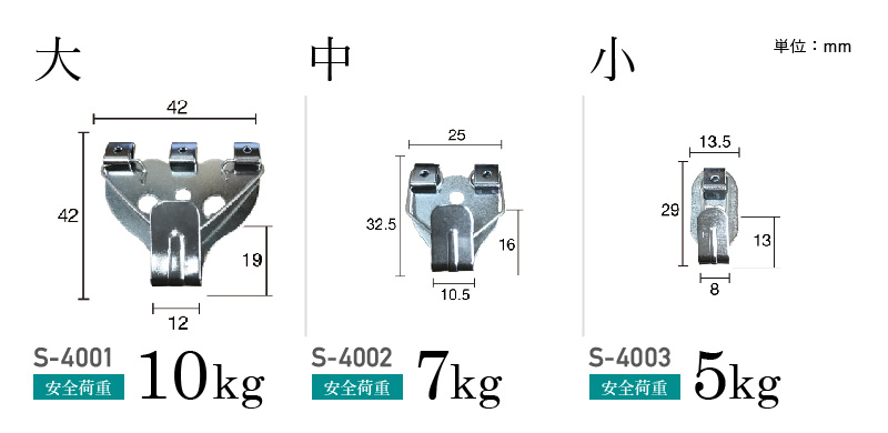 サイズは大・中・小の3サイズ展開。安全荷重はそれぞれ、「大=10kgまで」「中=7kgまで」「小=5kgまで」となっています。