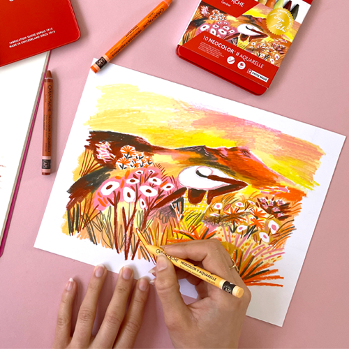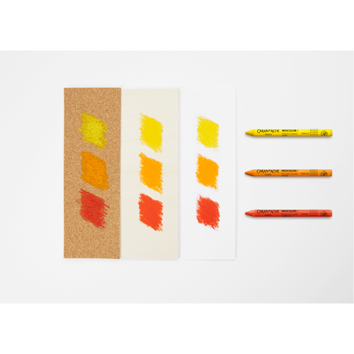 1975年の誕生以来、世界中で愛され続けているカランダッシュの水溶性ワックスパステル『ネオカラーⅡ』。スイスでは学校で使われているほど国民的なパステルです。パステルとして使うのはもちろん、水をふくんだ筆でなぞると溶けて水彩画のようになり、表現の幅がもちろん。プレキシグラスパレットで削ることで、絵具のように使うこともできます。