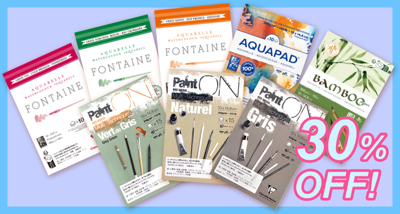 「Paint’ON-ペイントオン-」や「AQUAPAD-アクアパッド-」など様々な種類が揃っている、クレールフォンテーヌの画用紙。 クレールフォンテーヌの多くの商品が30%OFFになる「クレールフォンテーヌファインアーツ水彩紙フェア」は5/27(水)まで!この機会にぜひお求めください。
