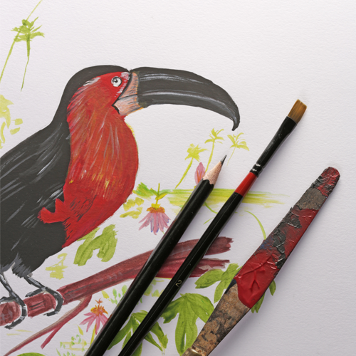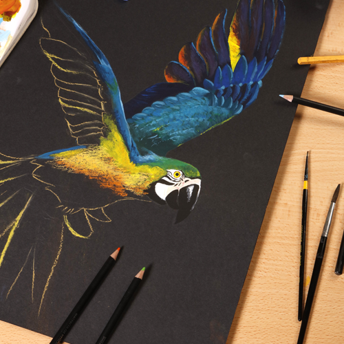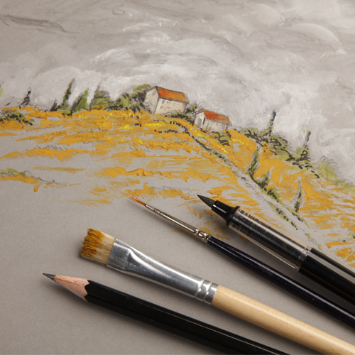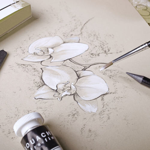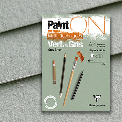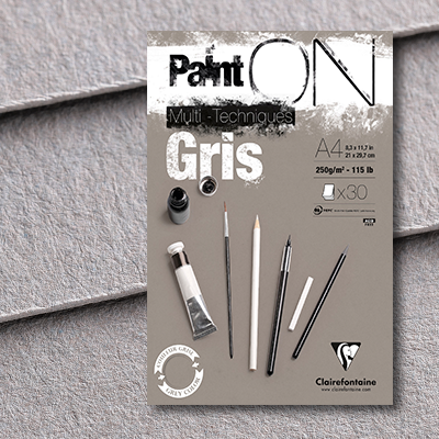 紙色は温かみのあるグレーの用紙で、顔料をとらえられるよう、表面は少しざらついています。様々な技法にハイライト効果を与えてくれます。