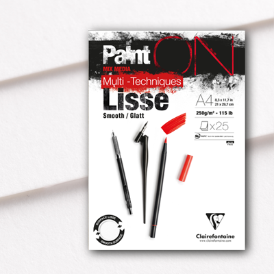 「PaintON-ペイントオン-」は、250g/m2と非常に丈夫な厚手用紙のパッド。裏移りしにくく、消しゴムなどを使用した場合も毛羽立ちにくいしっかりとした仕様です。