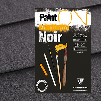 深いブラックの用紙で、顔料をとらえられるよう、表面は少しざらついています。様々な技法にハイライト効果を与えてくれます。20枚綴り。