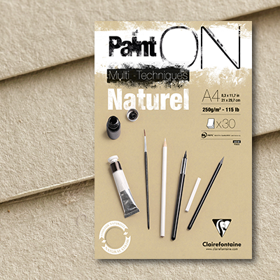 ナチュラルは、クラフト用紙のようなベージュ色の用紙です。顔料をとらえられるよう、表面は少しざらついています。チョーク・鉛筆画に最適です。30枚綴り。