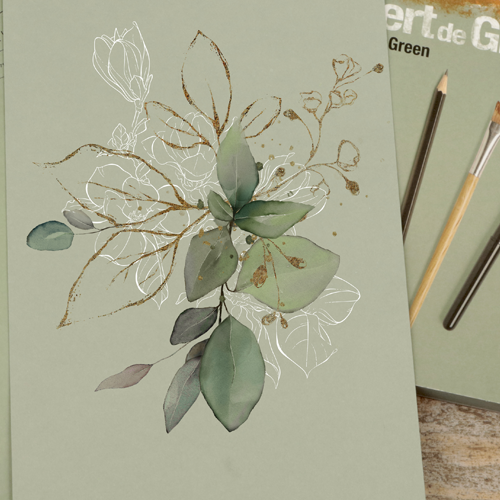 紙色はグレイッシュなセージグリーンで、顔料をとらえられるよう、表面は少しざらついています。メタリックやホワイトカラーの画材との相性は抜群です。30枚綴り。