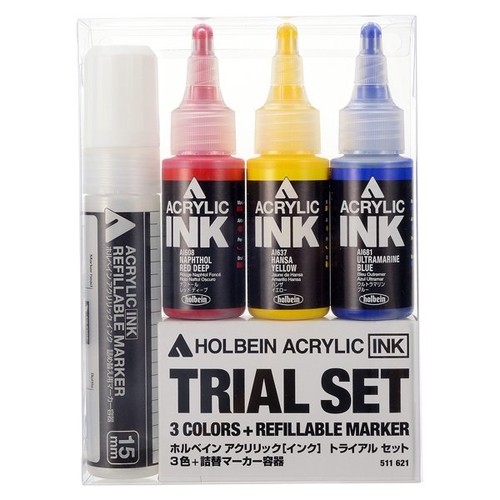 アクリリックインク 基本的な3色(30ml)と、詰め替え用のマーカー(15mm)1本がまとまったセット商品です。