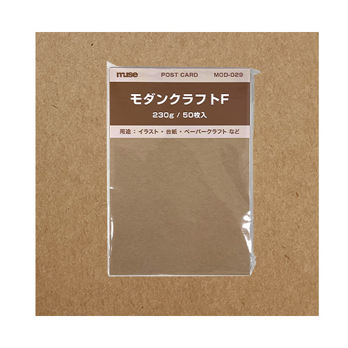 モダンクラフトFはレトロな仕上がりが人気の厚手のクラフト紙で、細かな繊維がブレンドされており、ナチュラルな質感が特徴です。素材そのものの風合いが前面に強く表れる茶色の紙肌はヴィンテージ感にあふれ、しっかりとしたコシと厚みがあるのでポストカードのほか、名刺、しおり、台紙、ペーパークラフトなど、幅広く活用できます。