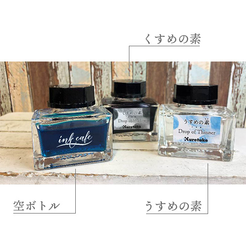 インクに適量加えて色をくすめることができるインク専用の色味調整液です。お気に入りのインクをくすみカラーに変えることができます。小皿などにインクを取り、少量ずつ色を確認しながら混ぜ合わせてください。作ったインクは、万年筆、ガラスペン、つけペン、呉竹からっぽペンなどでお使いいただけます。調合したインクはインク専用空ボトルにいれて保管できます。