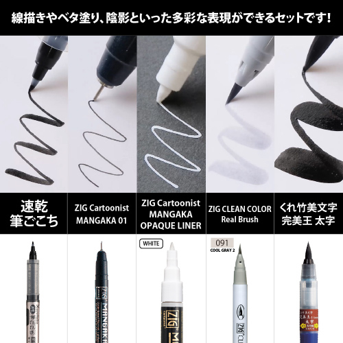 これからイラストを始めたい方にもオススメなペンのセットです。線描き、ベタ塗り、陰影、ハイライト等、一通りの表現が可能です。