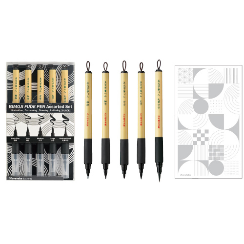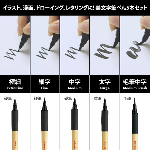 イラスト、漫画、ドローイング、レタリングに使える美文字筆ぺん全種類(5本)セット。