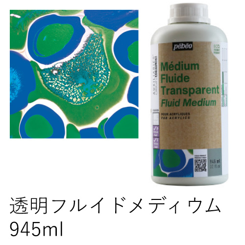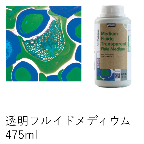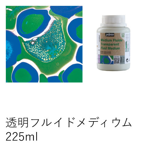 アクリル絵具と混ぜることにより、より流動性が増すメディウムです。また、透明性を増します。アクリル絵具と混ぜて、ポーリング技法にも使えます。少し水を混ぜて粘度を調整してください。乾燥後はサテンの仕上がりが得られます。