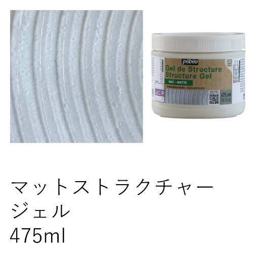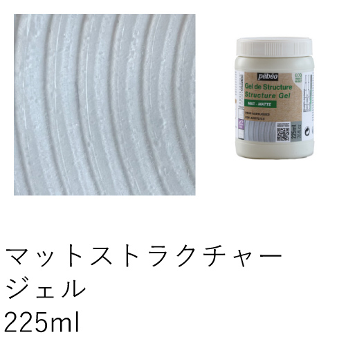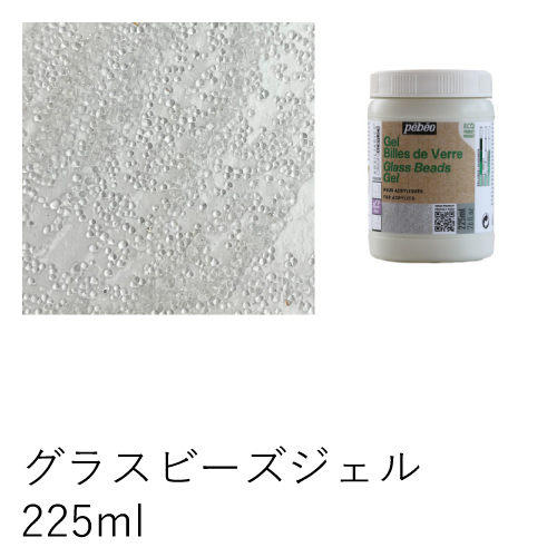 ガラス製の微小な球状の粒が入った透明ジェルで、乾燥後、ひび割れしない凹凸のあるレリーフ効果が得られます。メディウム単独での使用、アクリル絵具との混合、メディウムの乾燥後、上からアクリルでの着彩も可能です。