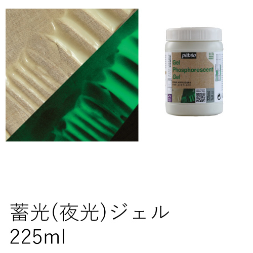 自然光、人工光を吸収し、暗いところで光ります。乾燥後、半透明でサテンマットの仕上がりになります。他の絵の具と混色せず、ペインティングナイフなどで単独で厚塗りするとより効果を発揮します。
