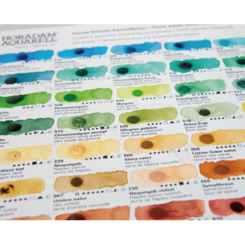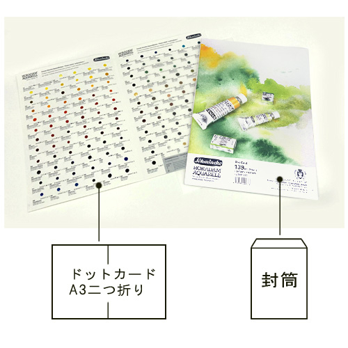 シュミンケ ホラダム水彩絵具をお試しいただけるドットカードです。139色が一つの紙に少しずつ充填されており、色見本の作成はもちろん、好みの色、使いやすい色をさがすことにも最適です。