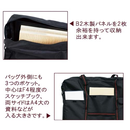 B2サイズの木製パネルが2枚ゆったり入る、撥水加工のバッグ。外側のセンターと両サイドにポケットがついており、A4資料やスケッチブックも一緒に持ち運べます。肩掛けの長さも調節できるほか 縦に持つための持ち手もついています。