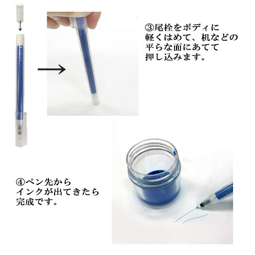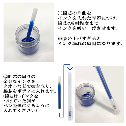 ②綿芯の周りの余分なインクをタオルなどで拭き取り、綿芯をボディに入れます。(綿芯は インクをつけていた側がペン先側にくるように入れてください)