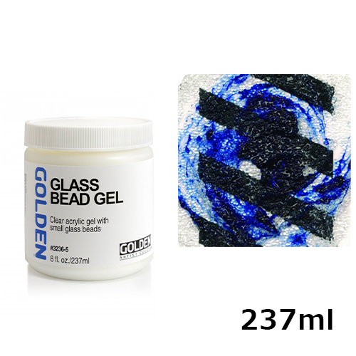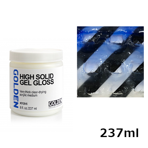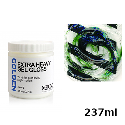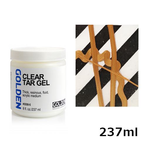 ・粘りのあるタールのような質感の無色透明のジェルです。非常に粘度が高く、糸を引くような粘り気があり、他のアクリルジェルとはまったく異なる感触です。パレットナイフなどから1本の糸のように流れるため、「垂らす」ようにして細かい線を描くのに便利です。すべてのゴールデンアクリリックスカラーとよく混ざりますが、フルイドカラーとの相性が最も良好です。