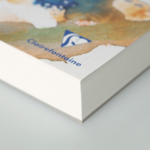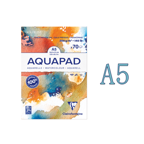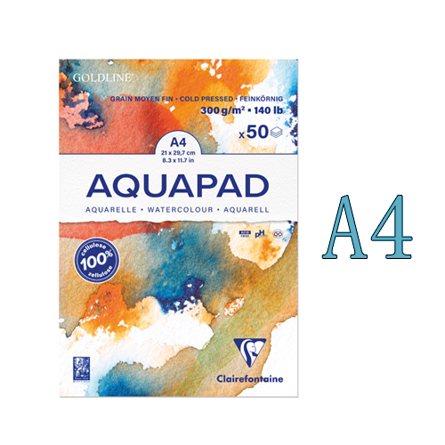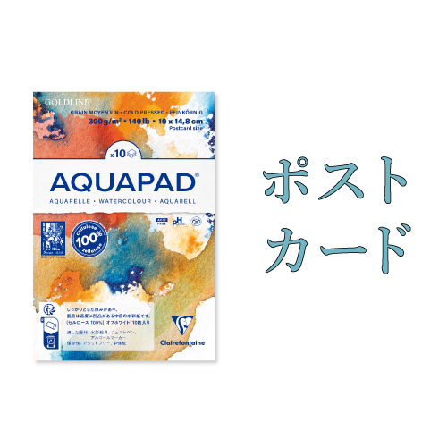 アクアパッドはセルロース100%の水彩紙です。表面が丈夫かつ、300g/m2と厚口なので、重ね塗りや細かい描き込みも問題なく行えます。