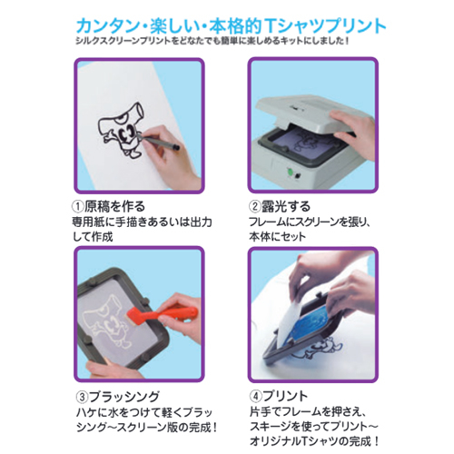 おうちプリントにお勧めのシルクスクリーンプリントのスターターセットです。スクリーンや4色のインクなどスクリーン版作成とプリントに必要なものが入っているので、届いたその日から直ぐにシルクスクリーンプリントが楽しめます。短時間で製版が出来るスクリーンや簡単に張れるスクリーンフレームなど、初心者にも優しい仕様です。本格的なシルクスクリーンプリントキットなので、出来上がりもとてもキレイで、最大約12cm角デザインの製版が可能です。小さいので好きなところにプリントがしやすいです。原稿は手描きイラストはもちろん、インクジェットやコピープリントもご利用頂けます。Tシャツくんセット、Tシャツくんジュニアセットの大きな違いは、スクリーン版の大きさとなります。どの機種で作ったスクリーン版もスクリーンの完成具合(表現できる線の細さやスクリーンの耐久性)は同じです。多色印刷をする場合には、版画同様に色毎のスクリーン版を用意し、薄い色からインクを重ねていきます。 Tシャツ以外の生地の他、絵ハガキなどの紙にも印刷が可能なので、アイデア次第で様々な創作活動が可能です。